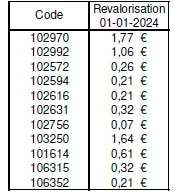 - Les prestations 101113, 101673, 101695 et 101710 sont revalorisées de 0,33€ après indexation de 6,05% ;