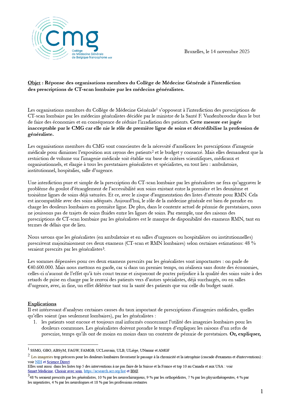 Vous trouverez ci-dessous la réponse des organisations membres du CMG à l’interdiction des prescriptions de CT-scan lombaire par les médecins généralistes. Ce courrier a été envoyé au ministre Vandenbroucke, à l’INAMI, à la presse, aux mutuelles et aux radiologues.