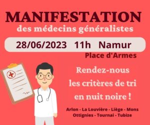 Le GBO/Cartel soutient l’appel Ă manifester lancĂ© par la FAGW aux mĂ©decins gĂ©nĂ©ralistes wallons. Cliquez ici pour retrouver le courrier expliquant les motivations qui nous ont conduits Ă soutenir les manifestations qui auront lieu ce mercredi 28 juin Ă 11h dans 9 villes de Wallonie (Arlon, Charleroi, La Louvière, Liège, Mons, Namur, Ottignies, Tournai et Tubize).